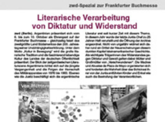 ZWD-MAGAZIN FRAUEN.GESELLSCHAFT UND POLITIK NR. 282 (2010) ERSCHIENEN : Frankfurter Buchmesse: Argentinische Militärdiktatur aus Frauen-Sicht mehr...