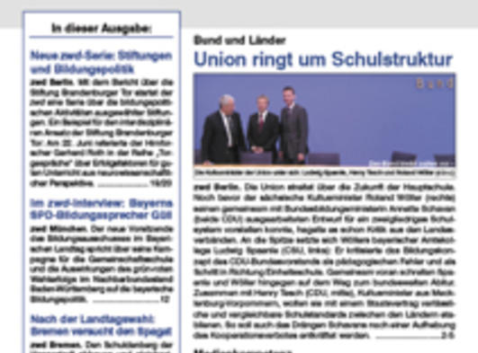 NEUE AUSGABE ZWD-BILDUNGSMAGAZIN 06-2011 ERSCHIENEN : Bund und Länder: Union ringt um Schulstruktur 21. April 4400 zwd Berlin. Lesen Sie in der neu erschienenen Ausgabe des zwd-Fachmagazins Bildung.Gesellschaft und Politik 6-2011: mehr...