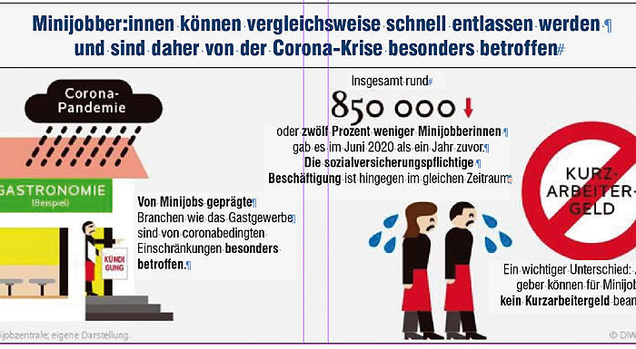 ​Minijobber*innen gehören nach dem Urteil des Deutschen Instituts für Wirtschaftsforschung (DIW) zu den Hauptverlierer*innen der Coronakrise auf dem Arbeitsmarkt. Minijobs sind prekäre Beschäftigungsverhältnisse. Sie haben eine ungenügende soziale Absicherung. Minijobs werden überwiegend von Frauen ausgeführt. Damit tragen diese Arbeitsverhältnisse zur geschlechtsspezifischen Spaltung des Arbeitsmarktes bei. Ein Bericht unseres Redaktionsmitglieds Dr. Dagmar Schlapeit-Beck. mehr...