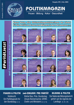 RedaktionIn der aktuellen Ausgabe des zwd-POLITIKMAGAZINs geht es um die im Bundestag anhängige Wahlrechtsreform. Sie sollte durch Paritätsregelungen mehr Frauen Mandate im Bundestag sichern, doch davon ist bisher nur am Rande die Rede. Die bundesweite Kampagne "PARITÄTJETZT", die von mehr als 80 zivilgesellschaftlichen Organisationen getragen wird, hat jetzt auf Initiative der Gesellschaft Chancengleichheit besonderen Zuspruch erhalten. Alle 16 Chef:innen von Frauen- und Gleichstellungsministerien haben in Testimonials ihre Unterstützung für die Paritätsforderung bekundet (siehe unten). Titelthema der gedruckten und digitalen Ausgabe 395.