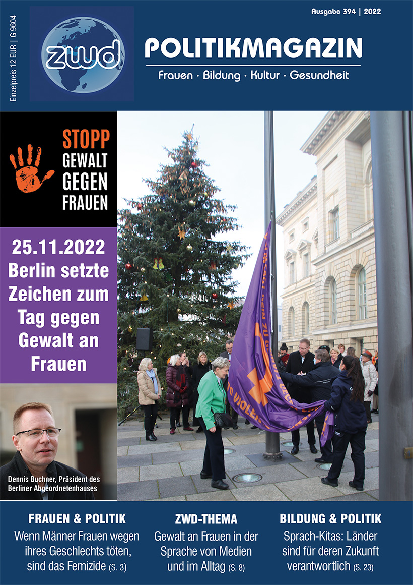 In der aktuellen Ausgabe des zwd-POLITIKMAGAZINs geht es um die im Bundestag anhängige Wahlrechtsreform. Sie sollte durch Paritätsregelungen mehr Frauen Mandate im Bundestag sichern, doch davon ist bisher nur am Rande die Rede. Die bundesweite Kampagne "PARITÄTJETZT", die von mehr als 80 zivilgesellschaftlichen Organisationen getragen wird, hat jetzt auf Initiative der Gesellschaft Chancengleichheit besonderen Zuspruch erhalten. Alle 16 Chef:innen von Frauen- und Gleichstellungsministerien haben in Testimonials ihre Unterstützung für die Paritätsforderung bekundet (siehe unten). Titelthema der gedruckten und digitalen Ausgabe 395.