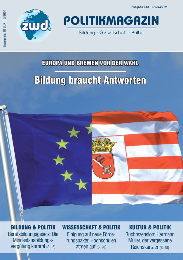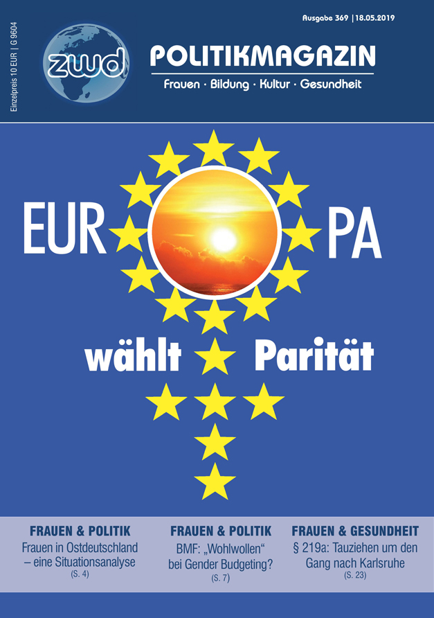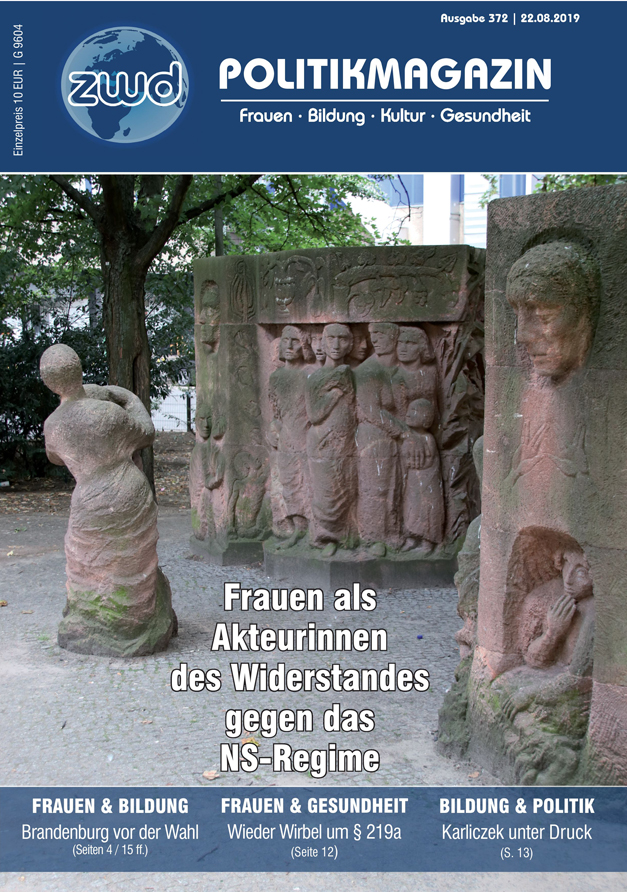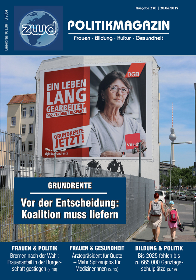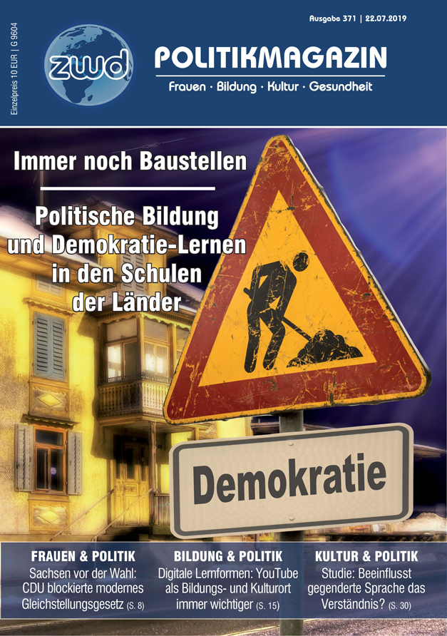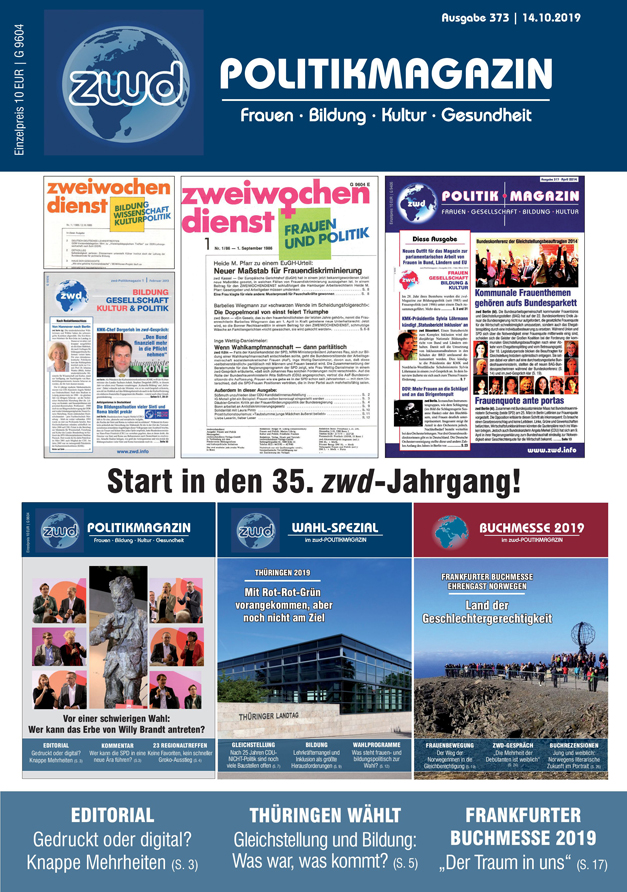 Holger H. LührigDas zwd-POLITIKMAGAZIN (Ausgabe 403) widmet seine Titelgeschichte dem erwarteten Ergebnis der Landtagswahl in Brandenburg und sieht die gleiche Teilhabe von Frauen in Gefahr. In der Bundespolitik haben wir die frauenpolitische Sprecherin der SPD-Bundestagsfraktion Leni Breymaier nach ihrer Agenda für die letzten 12 Monate der Wahlperiode des Bundestages gefragt. Wir beleuchten drei Kernthemen: Parität, Entgelttransparenzgesetz (Beitrag von Heide Pfarr) und Reform des § 218.