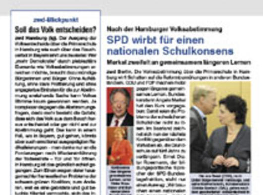 ZWD-MAGAZIN BILDUNG.GESELLSCHAFT UND POLITIK 07/2010 ERSCHIENEN : Nach dem Hamburger Volksentscheid: SPD wirbt für nationalen Schulkonsens mehr...