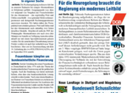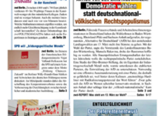 Führende Frauenverbände und Arbeitnehmerinnen-Organisationen in Deutschland haben die Wählerinnen in Baden-Württemberg, Rheinland-Pfalz und Sachsen-Anhalt aufgerufen, der sogenannten "Alternative für Deutschland" bei den anstehenden Landtagswahlen nicht ihre Stimme zu geben. Der Rassismus dürfe nicht parlamentarisch hoffähig werden, warnten Sprecherinnen wie die Vorsitzende des Landesfrauenrates Baden-Württemberg, Manuela Rakavina. Die Partei, in der Nach eine Studie der Otto-Brenner-Stiftung "uneinsichtige Hardliner mit Radikalisierungspotenzial das Wort führen", wolle alle frauenpolitischen Errungenschaften der letzten Jahrzehnte zurückdrehen.
